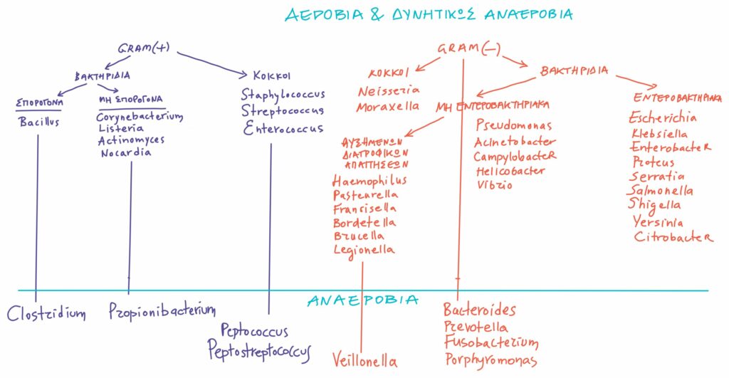 Αυτό ακριβώς θα κάνετε τακτοποιώντας τα μικρόβια, ανάλογα με αυτές τους τις ιδιότητες αρχικά στο χαρτί, και από κεί και στο μυαλό σας. Μια καλή άσκηση λοιπόν είναι να ξεκινήσετε γράφοντας – όχι μία και δύο αλλά – αρκετές φορές, με το χεράκι σας, όχι πληκτρολογώντας, την ταξινόμηση των βακτηριακών γενών με τα οποία θα ασχοληθούμε όταν ξεκινήσει το εξάμηνο. Ακολουθεί ενδεικτικό μόνο παράδειγμα γραμμένο με το δικό μου χεράκι [δεν περιέχει όλα τα βακτήρια].