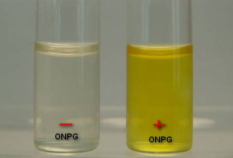 Η δοκιμασία ONPG ελέγχει την παραγωγή του ενζύμου β-γαλακτοσιδάση και αφορά τη ζύμωση της λακτόζης (ακολουθούν γνώσεις για επαγγελματίες, μπορείτε να σταματήσετε να διαβάζετε ΕΔΩ, με bold και υπογραμμισμένα αυτά που πρέπει να ξέρετε). Θεωρείται θετική όταν παράγεται κίτρινο χρώμα στην αντίδραση που βλέπετε παρακάτω..